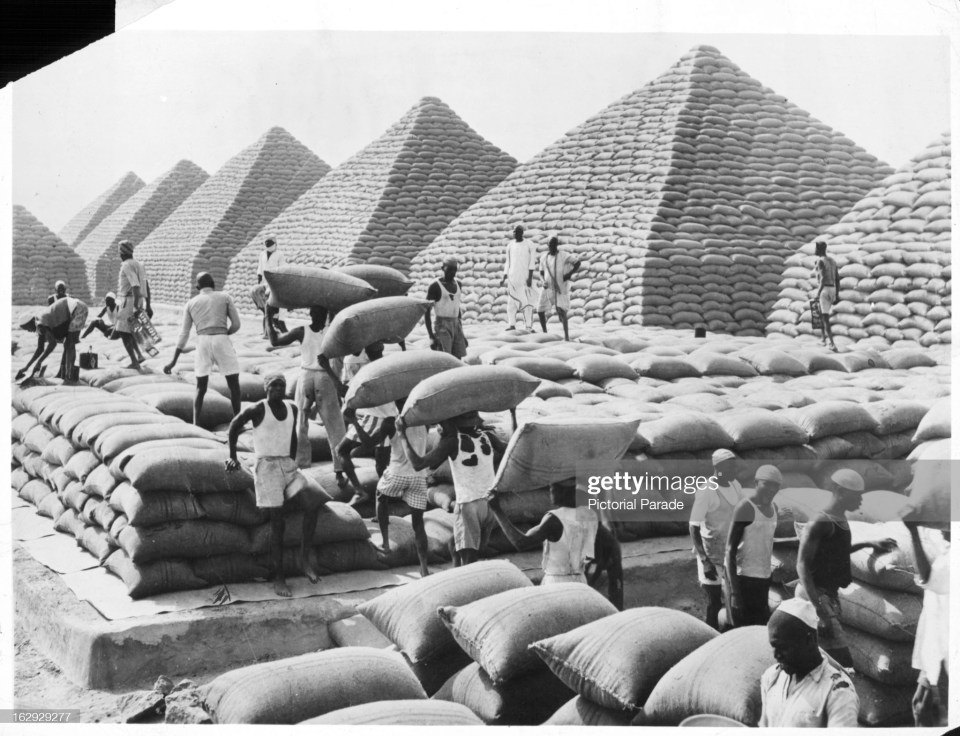 Peanuts, bagged and ready for transport, are stacked in pyramids at Kano, Northern Region, Nigeria, 1955. (Photo byPictorial Parade/Archive Photos/Getty Images)