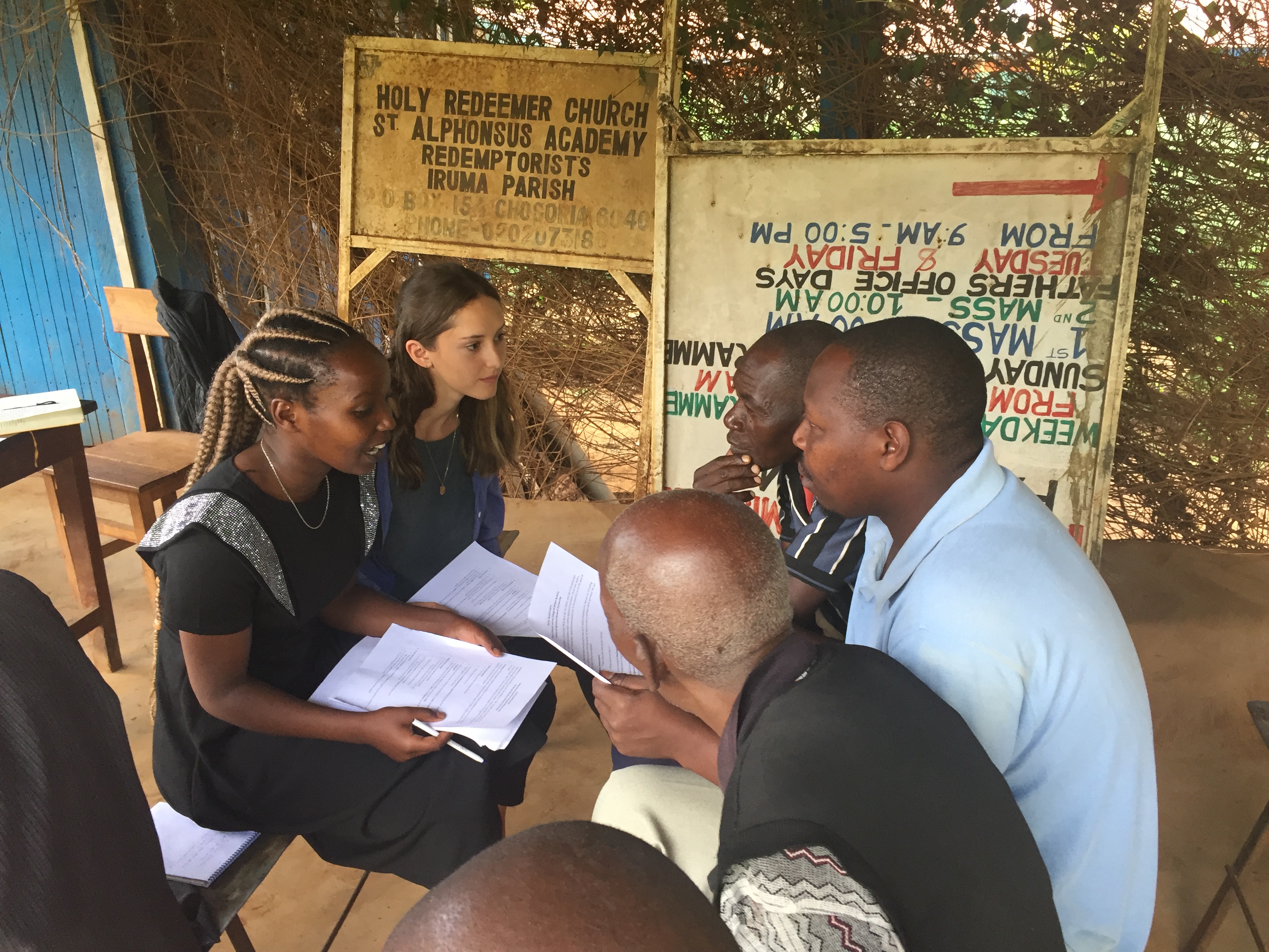 Regina Makomi of Chuka University (far left) and Darrien Spitz of W&M ’19 (second to left) interview members of a banana cooperative in Iruma, Kenya about the impact of climate change on their farming practices in May 2019.